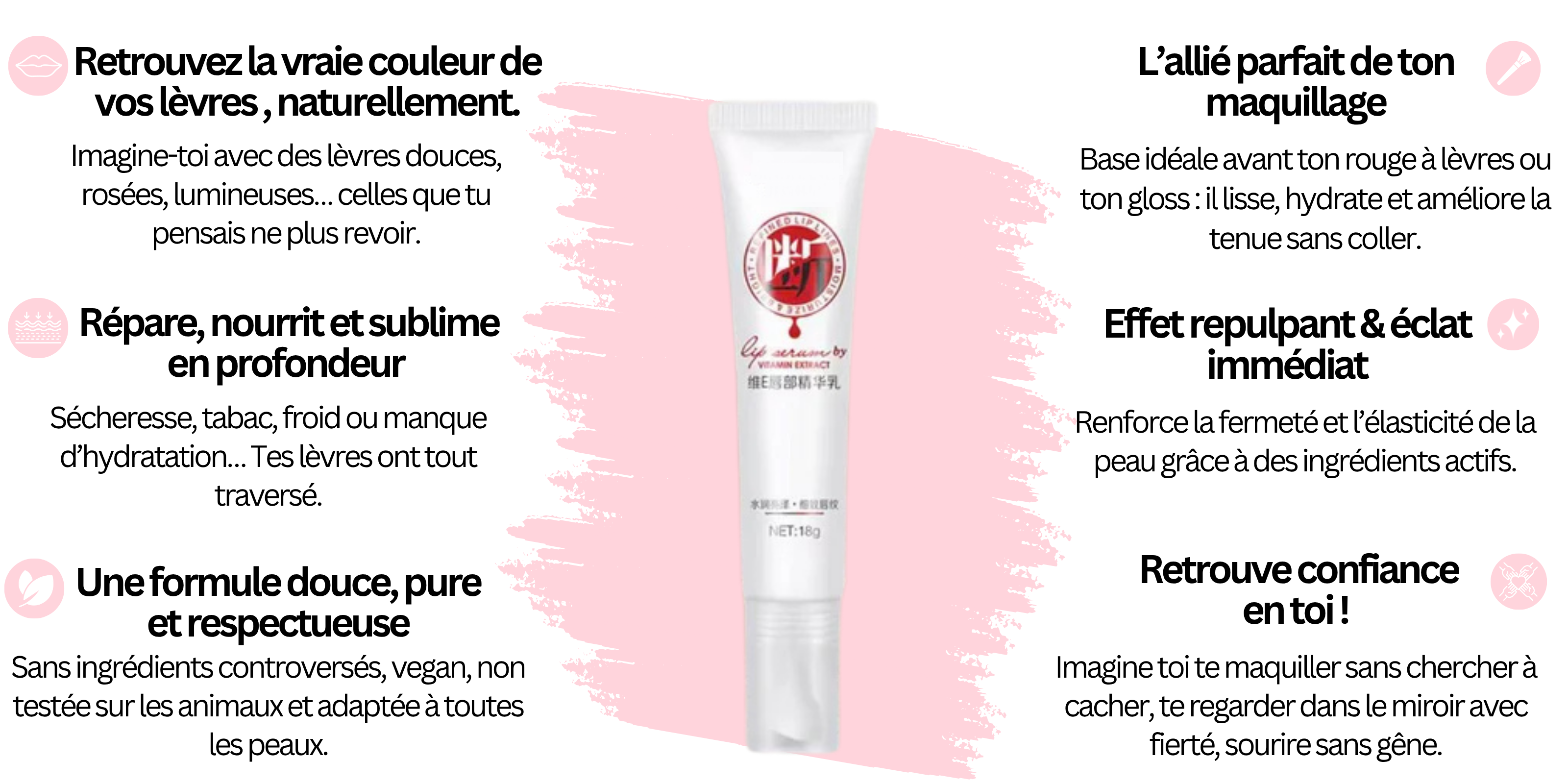 Non, notre sérum n’est ni collant ni gras. Sa texture légère s’absorbe rapidement et laisse vos lèvres douces et confortables. Vous pouvez l’utiliser comme base de maquillage pour lisser vos lèvres et améliorer la tenue de votre rouge à lèvres. Il peut aussi s’appliquer en masque de nuit réparateur : pendant votre sommeil, il régénère vos lèvres pour un réveil avec des lèvres souples, éclatantes et revitalisées.